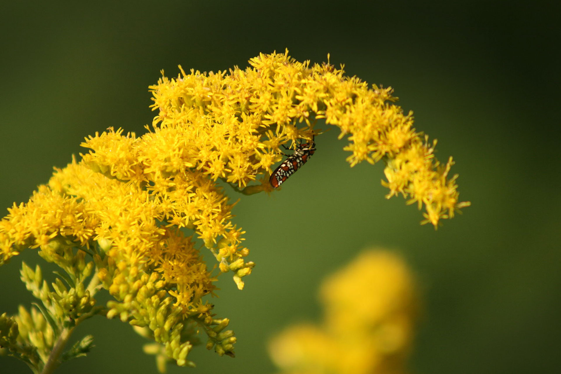 - Goldenrod: If you can find a spot to enjoy this perennial that is often considered for use in more informal plantings, you’ll be doing a favor for 42 species of pollen specialist bees that rely on this plant. Over 100 species of moth/butterfly caterpillars eat the leaves and shoots. Adult monarch butterflies feed on goldenrod nectar on their migration. Beetles, true bugs, and grasshoppers also devour goldenrod. There are different varieties available at nurseries, so surely there is one that suits your garden!