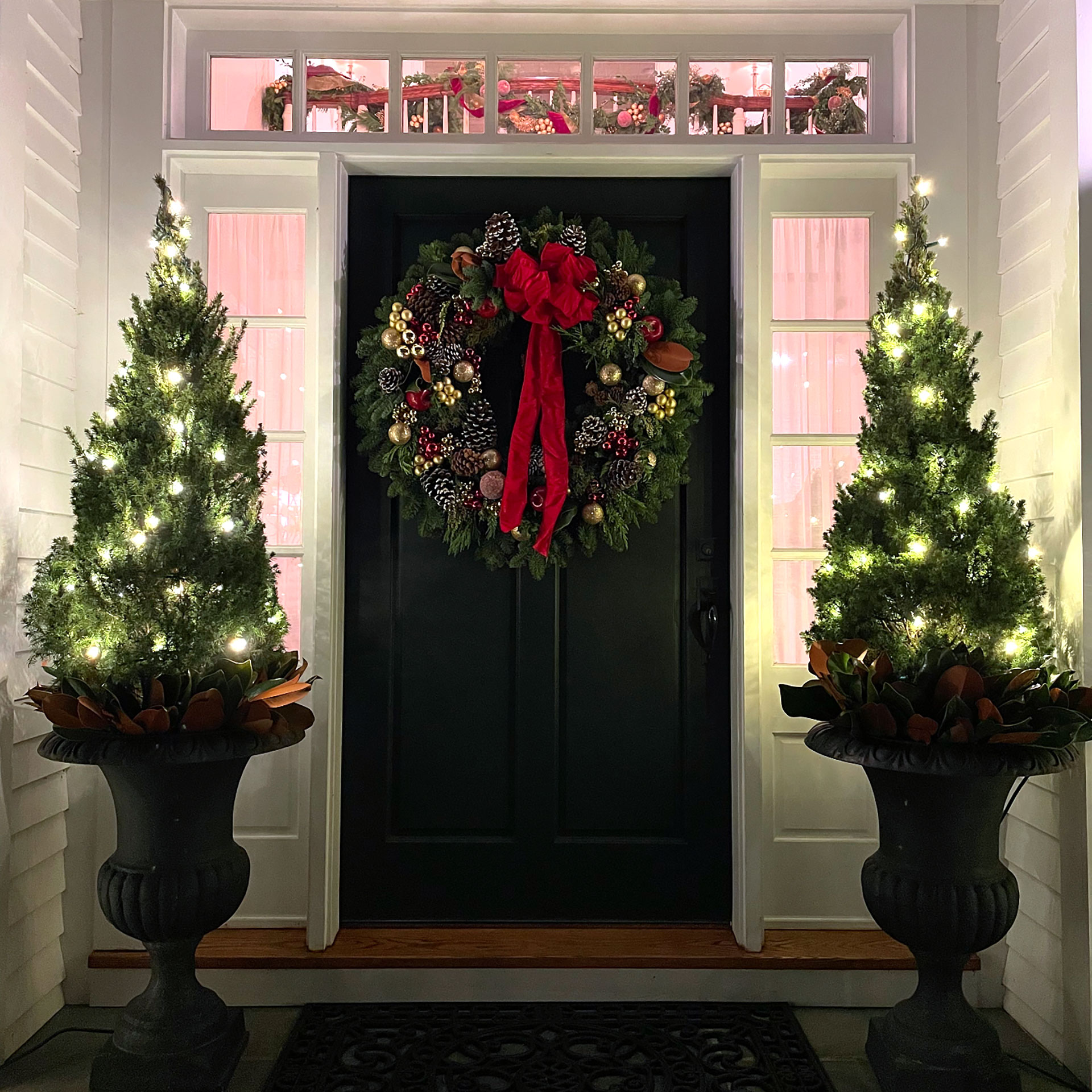 Front entries are often the focal point of winter décor. Because plantings recede in winter, evergreen materials provide structure and natural contrast.