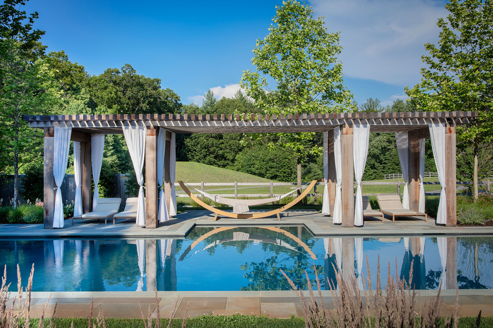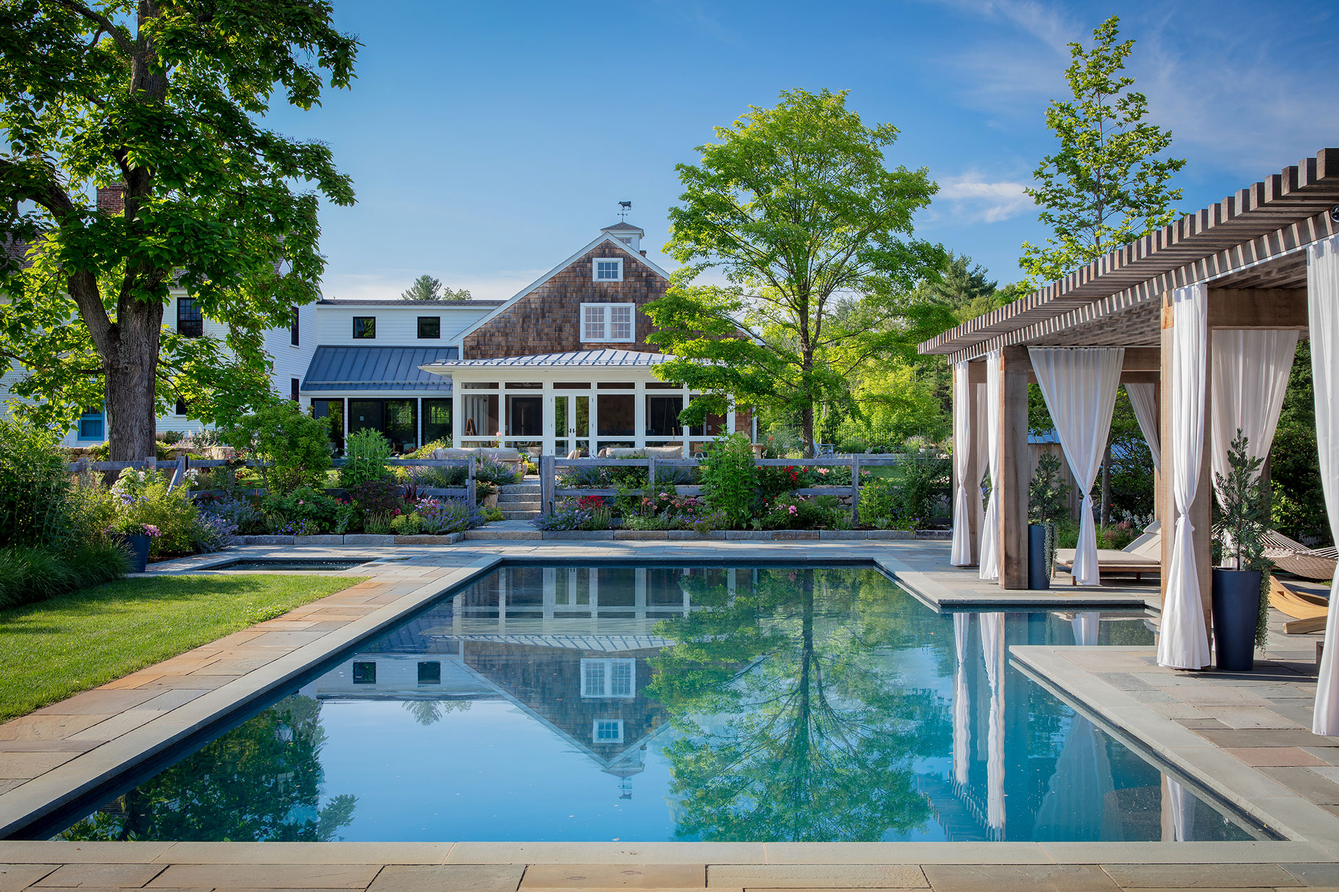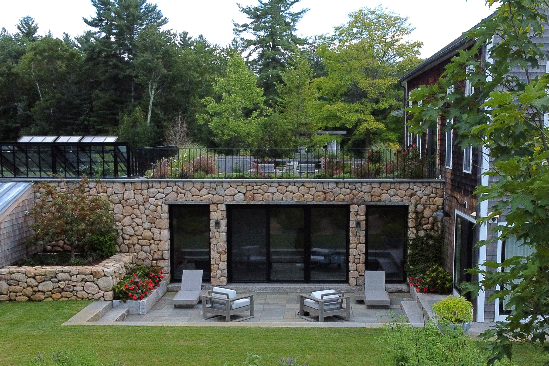 Productive elements were intentionally woven into the design. Orchards and vegetable gardens strengthen the connection between land and food, while a custom greenhouse, anchored by an antique granite foundation, supports year-round growing. Modern amenities were integrated with restraint, including a pool area with a floating cedar pergola that feels settled into the landscape rather than placed upon it. Throughout the property, existing materials were salvaged and reused, reinforcing authenticity and reducing environmental impact.