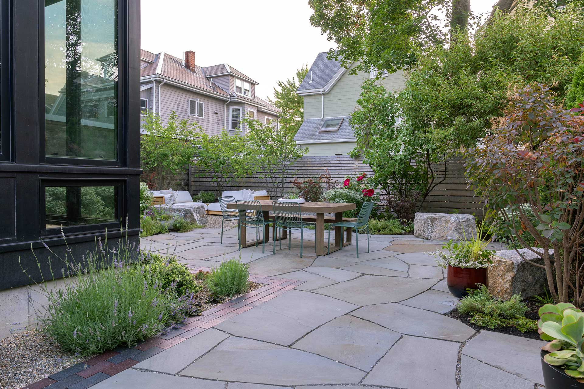 A separate gravel seating area, anchored by large stone blocks and surrounded by native plantings, offers a more relaxed setting for gathering. Together, these features demonstrate how thoughtful material selection and spatial planning can transform small Cambridge and Somerville backyards into highly usable, layered outdoor environments.