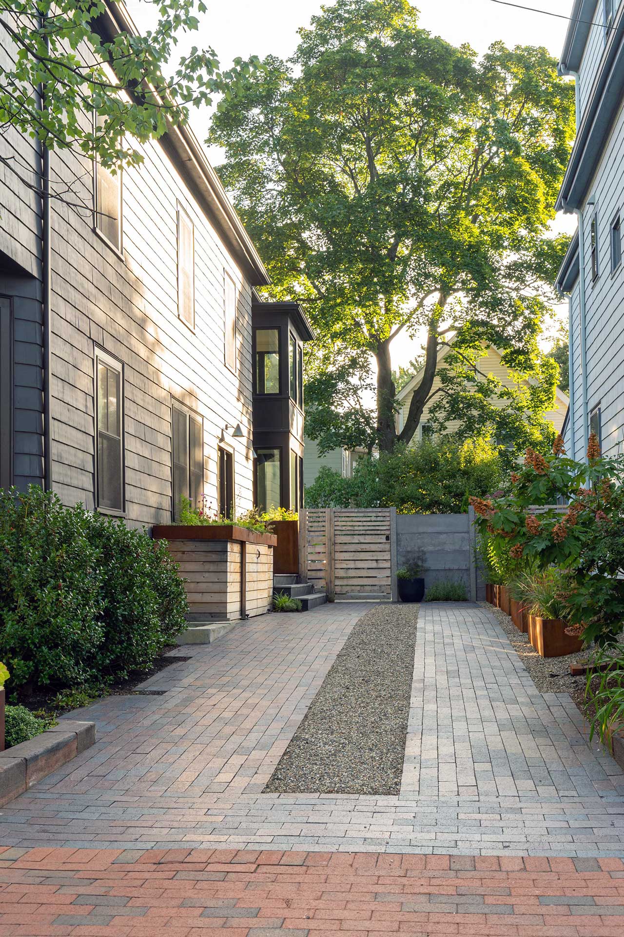 The driveway integrates permeable pavers with a central gravel band, improving drainage while reinforcing the linear organization of the site. Together, these elements create a cohesive threshold that sets the tone for the spaces beyond, balancing durability, planting, and proportion within a compact footprint.