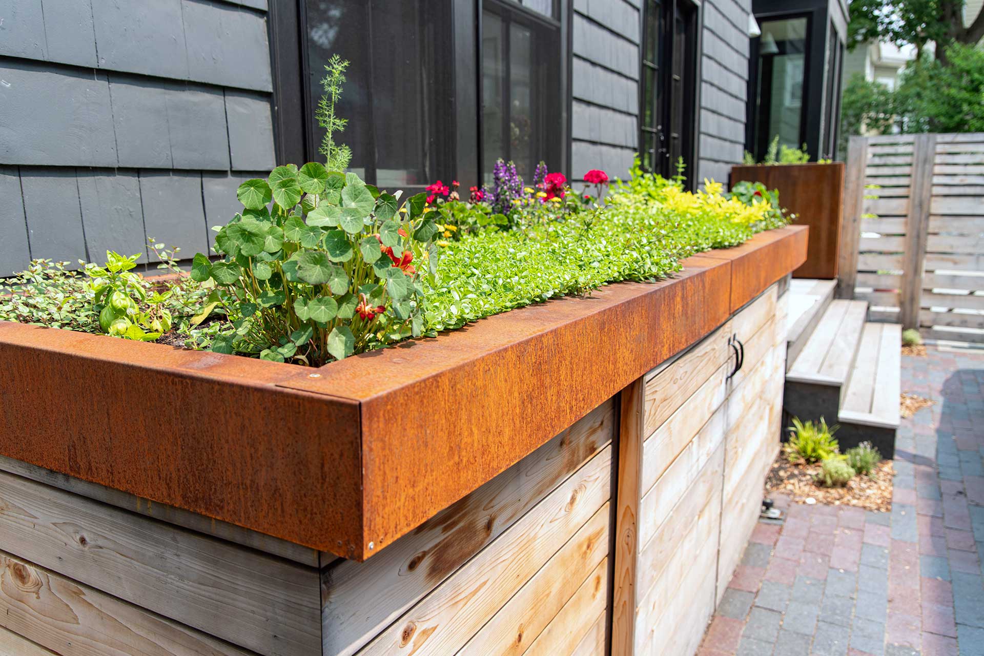 Custom wood cabinetry adds warmth, while weathering steel planters introduce durable structure and integrate edible herbs directly into the design. Positioned just beyond the house, this area allows culinary use, planting, and gathering to work together, making the landscape feel like an intentional continuation of life indoors.
