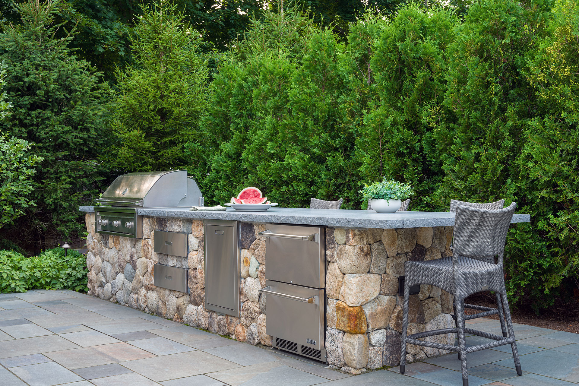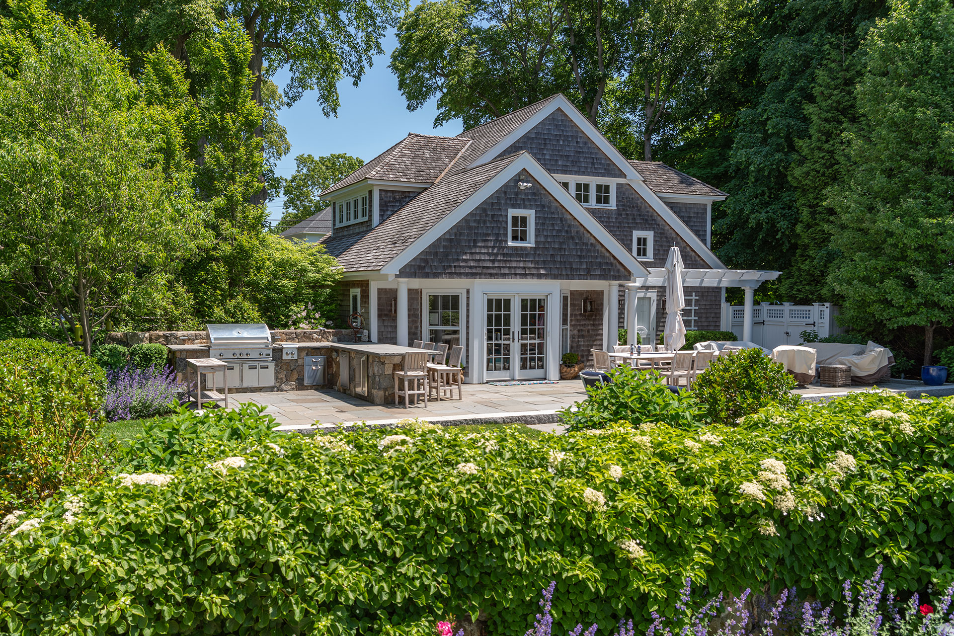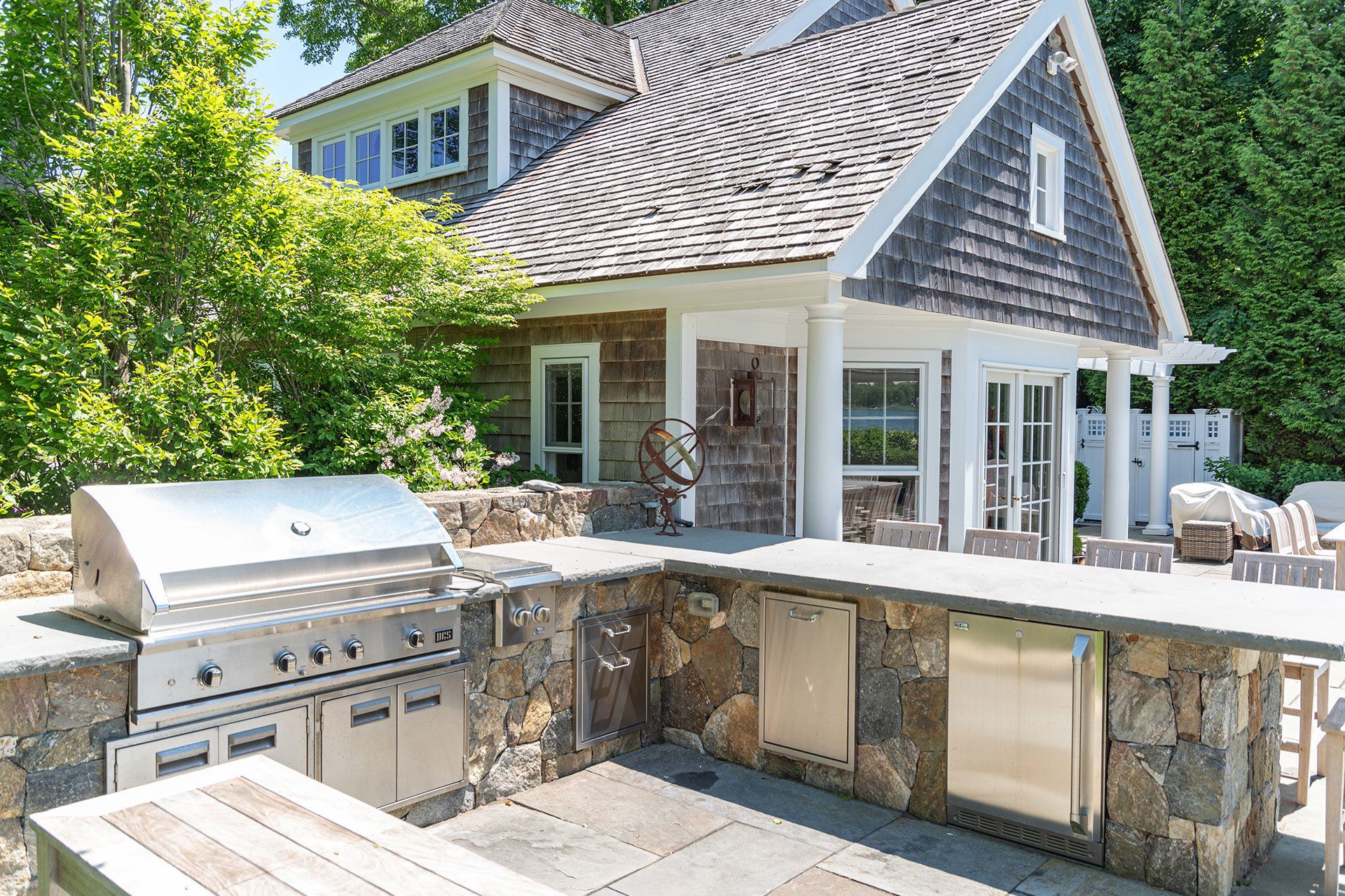 Outdoor dining is most successful when it’s designed as an integral part of the landscape rather than an afterthought. The best spaces anticipate how people move, gather, cook, and linger, placing dining and cooking areas where they feel intuitive, comfortable, and connected to the rest of the property. Durable materials, flexible layouts, and thoughtful plantings support both casual meals and larger gatherings, creating a sense of enclosure.