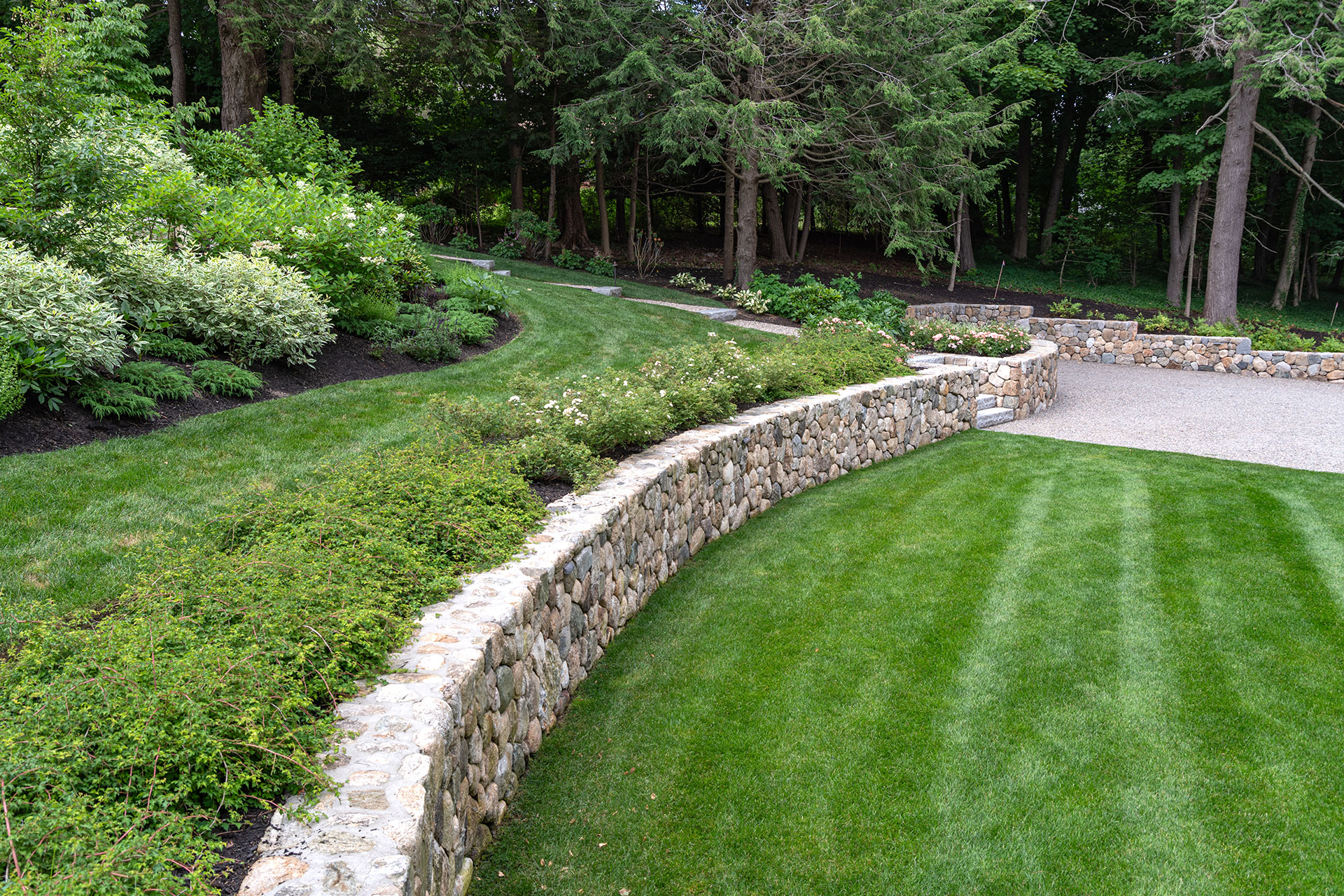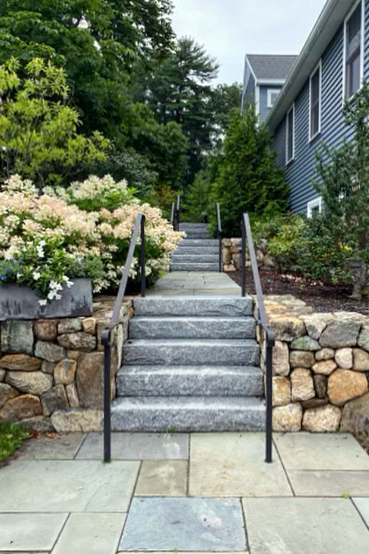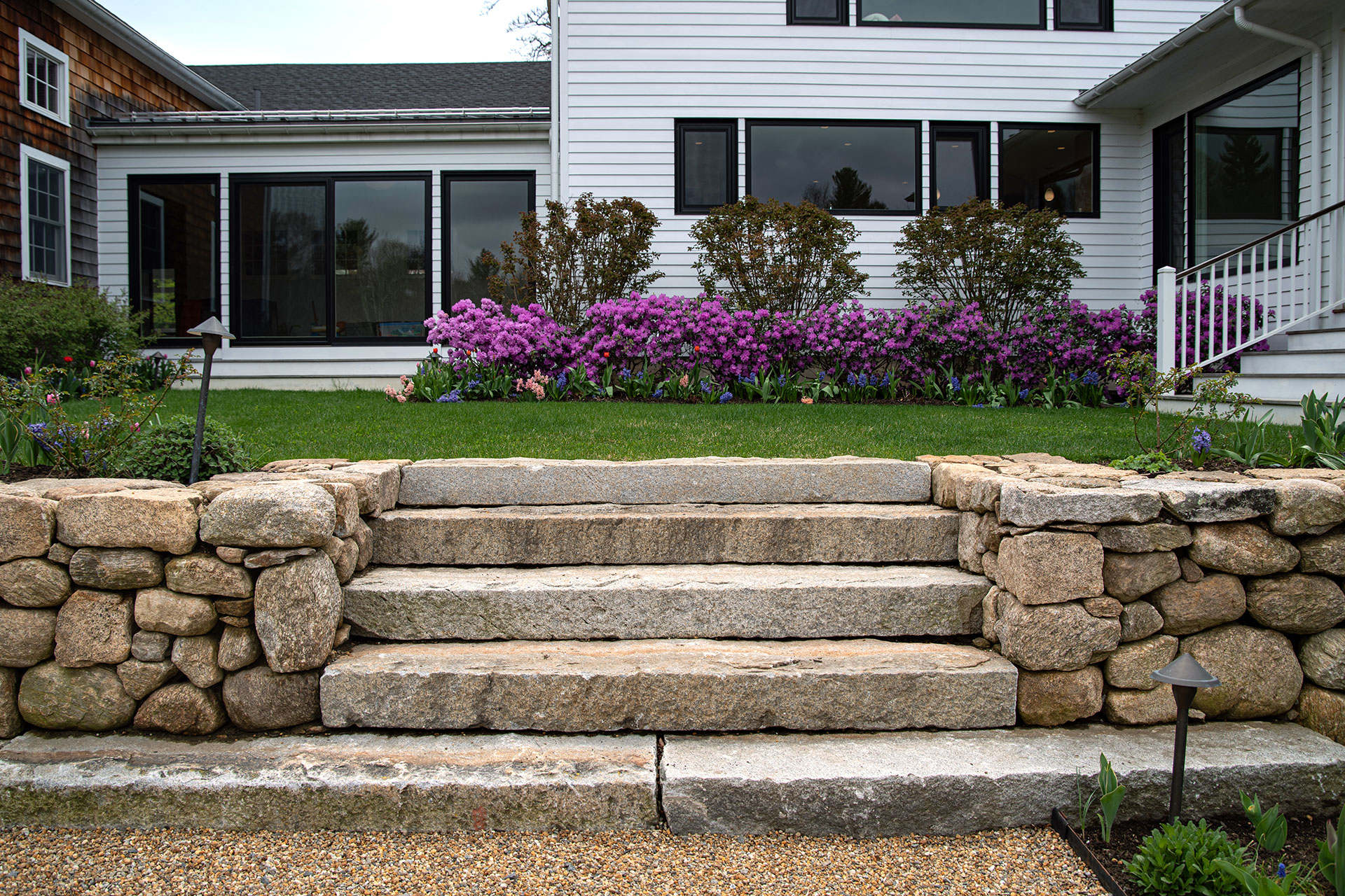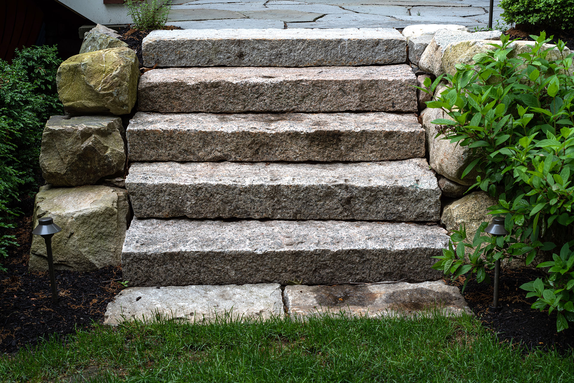 Outdoor walls and steps provide structure, durability, and visual clarity within a residential landscape. Built from materials such as granite, fieldstone, or bluestone, these elements manage grade changes, define outdoor rooms, and create safe, comfortable circulation. Styles range from dry-laid stone walls with a timeless, organic feel to mortared masonry that supports more formal architecture. Proper base preparation, drainage, and stone selection are critical, especially in the Boston area, where freeze–thaw cycles place added stress on hardscape.