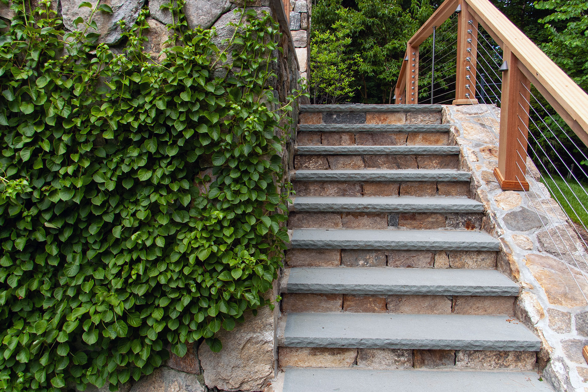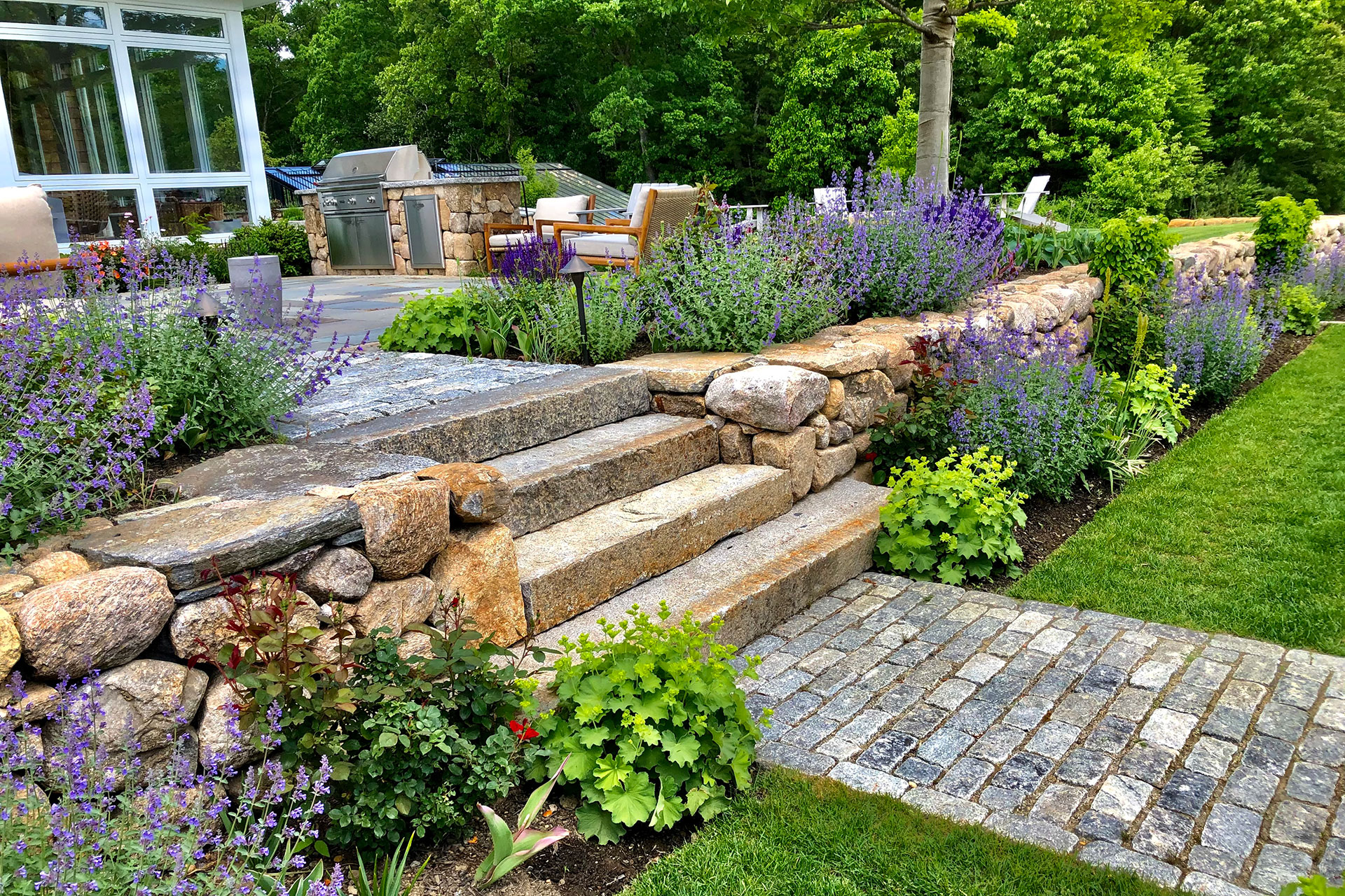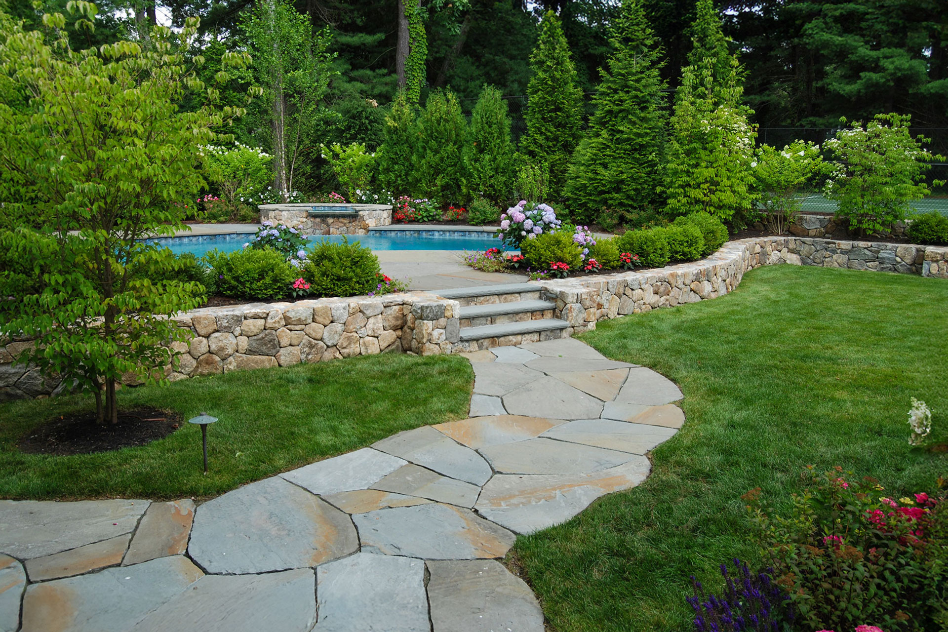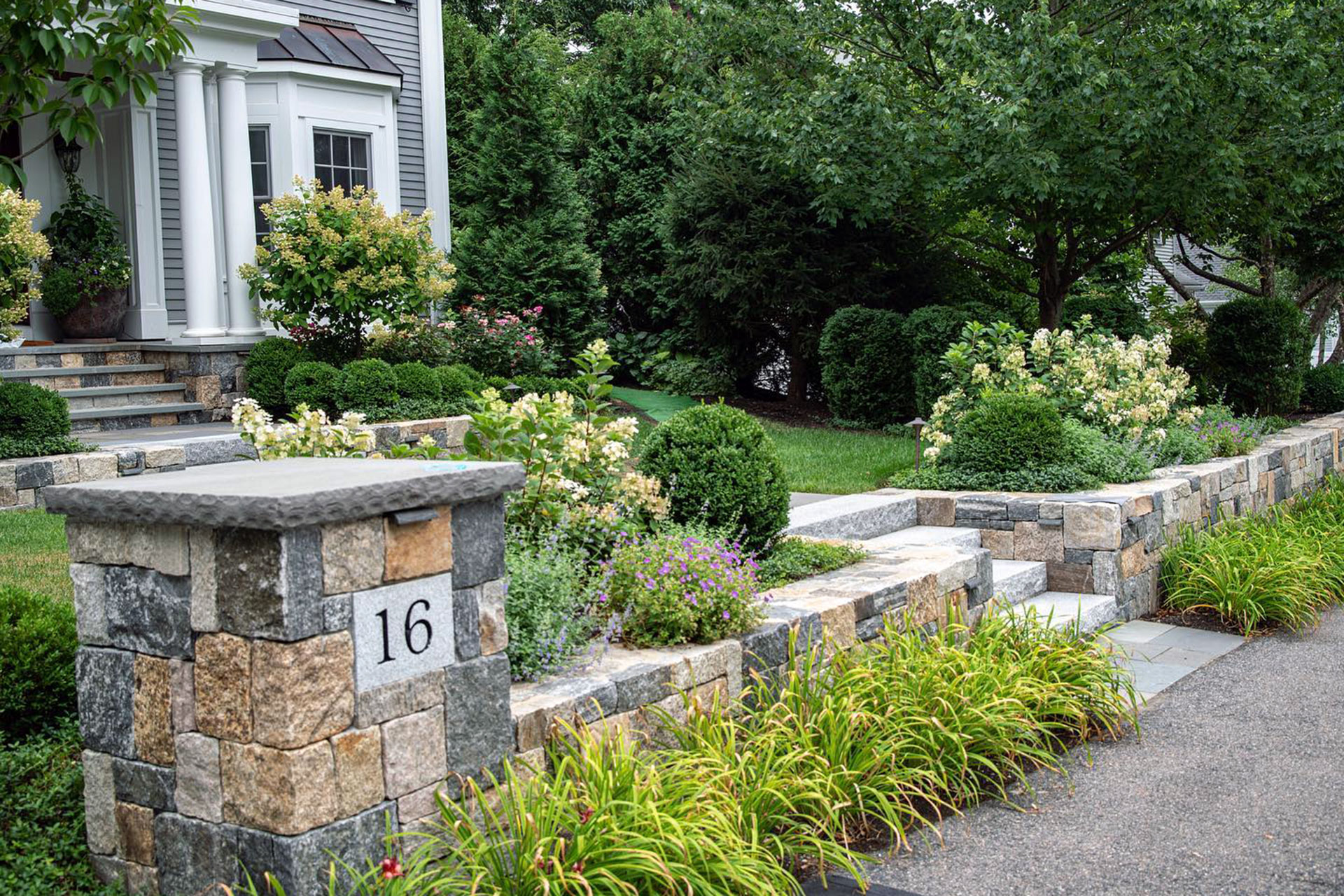 Outdoor walls and steps provide structure, durability, and visual clarity within a residential landscape. Built from materials such as granite, fieldstone, or bluestone, these elements manage grade changes, define outdoor rooms, and create safe, comfortable circulation. Styles range from dry-laid stone walls with a timeless, organic feel to mortared masonry that supports more formal architecture. Proper base preparation, drainage, and stone selection are critical, especially in the Boston area, where freeze–thaw cycles place added stress on hardscape.