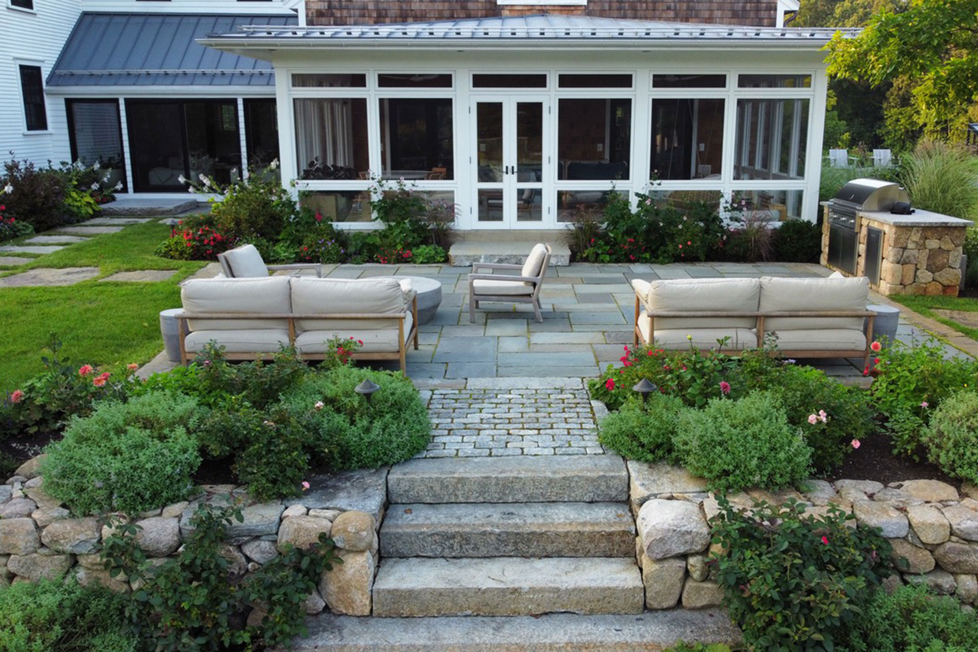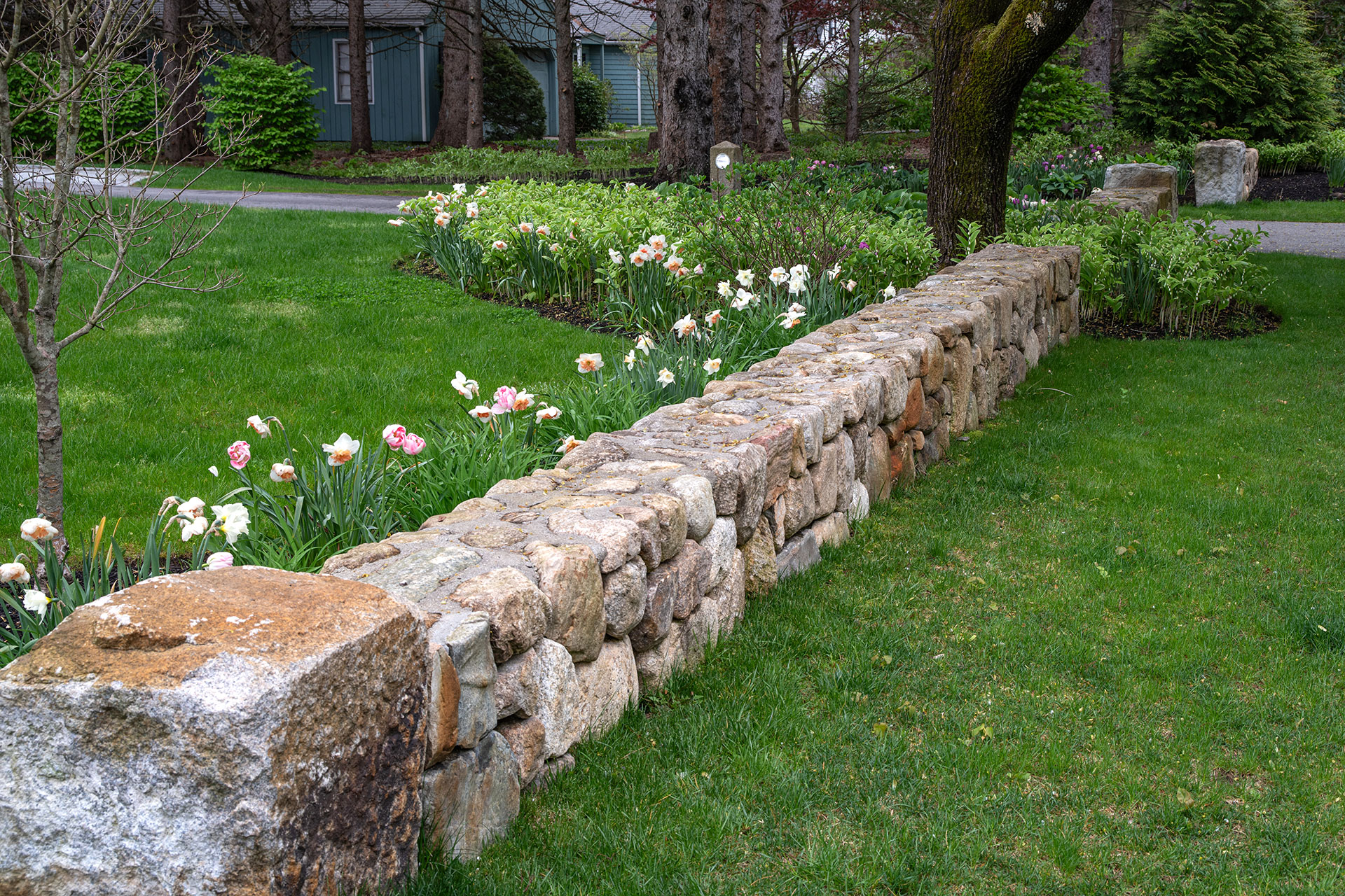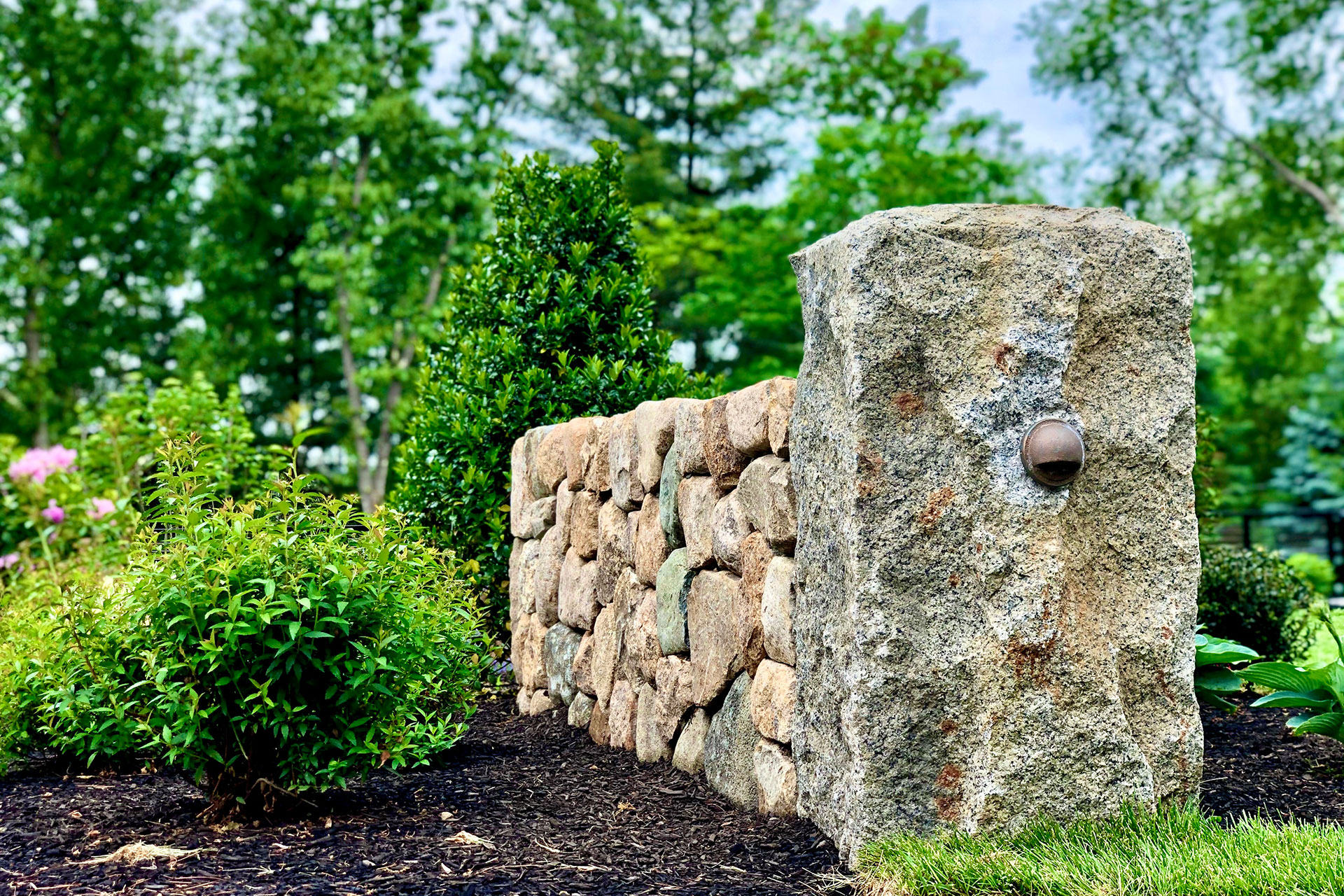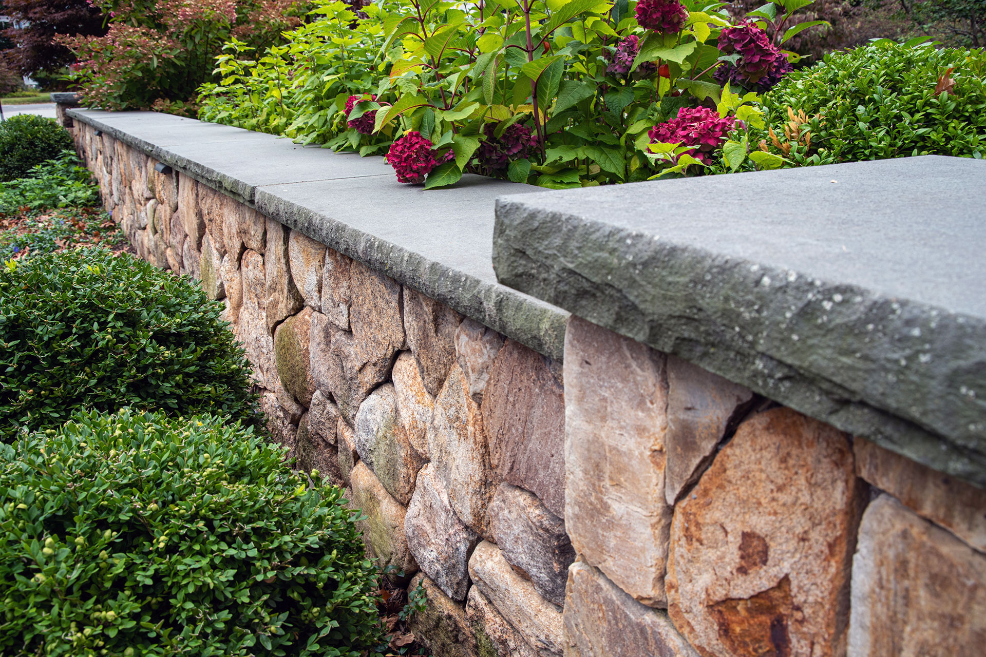 Outdoor walls and steps provide structure, durability, and visual clarity within a residential landscape. Built from materials such as granite, fieldstone, or bluestone, these elements manage grade changes, define outdoor rooms, and create safe, comfortable circulation. Styles range from dry-laid stone walls with a timeless, organic feel to mortared masonry that supports more formal architecture. Proper base preparation, drainage, and stone selection are critical, especially in the Boston area, where freeze–thaw cycles place added stress on hardscape.