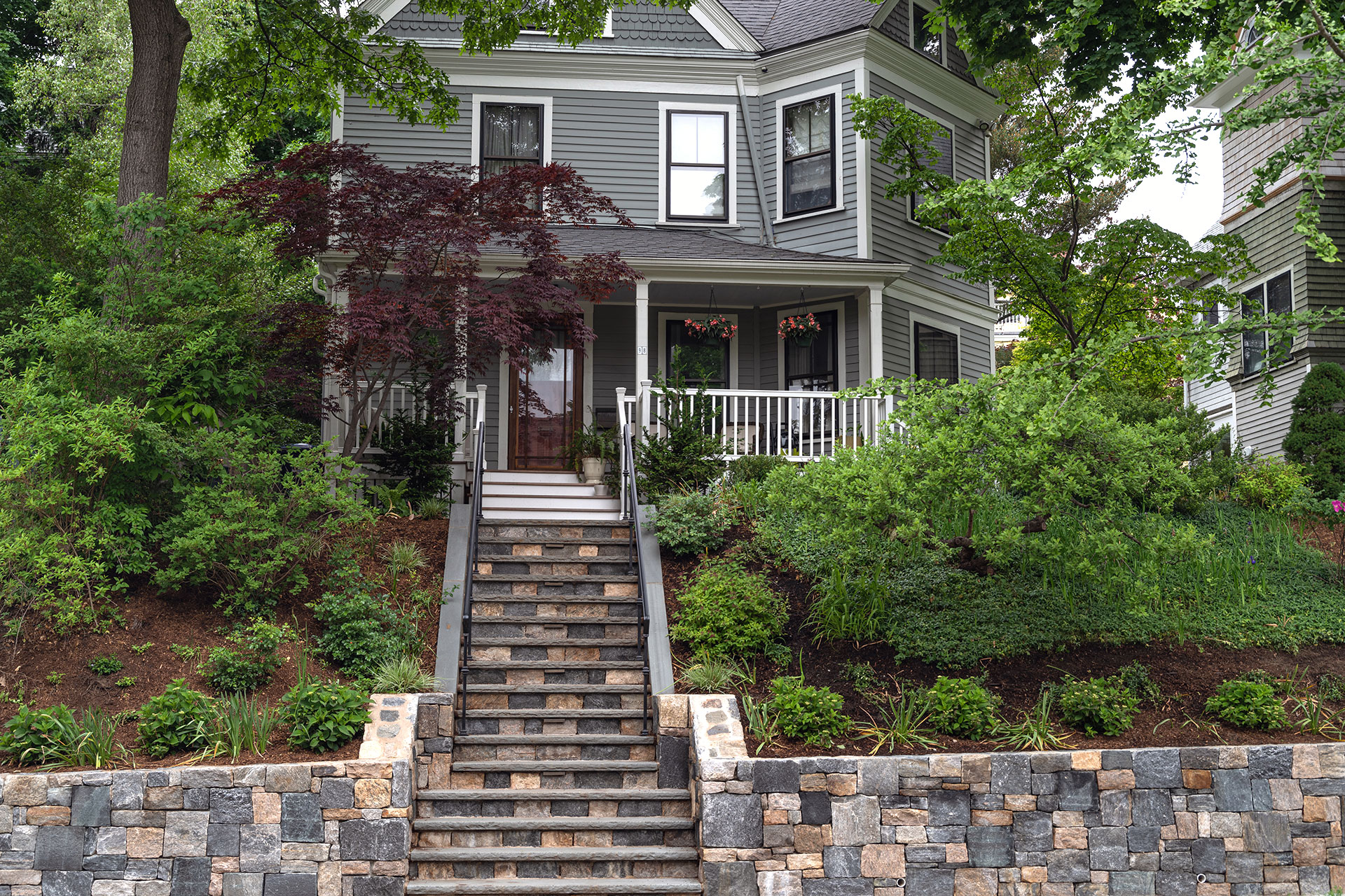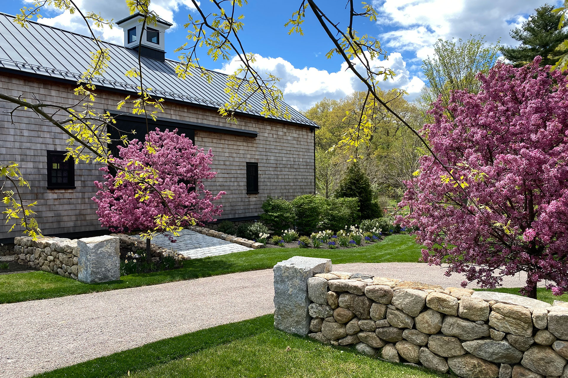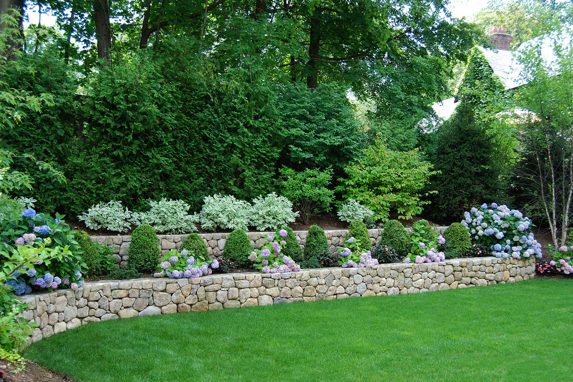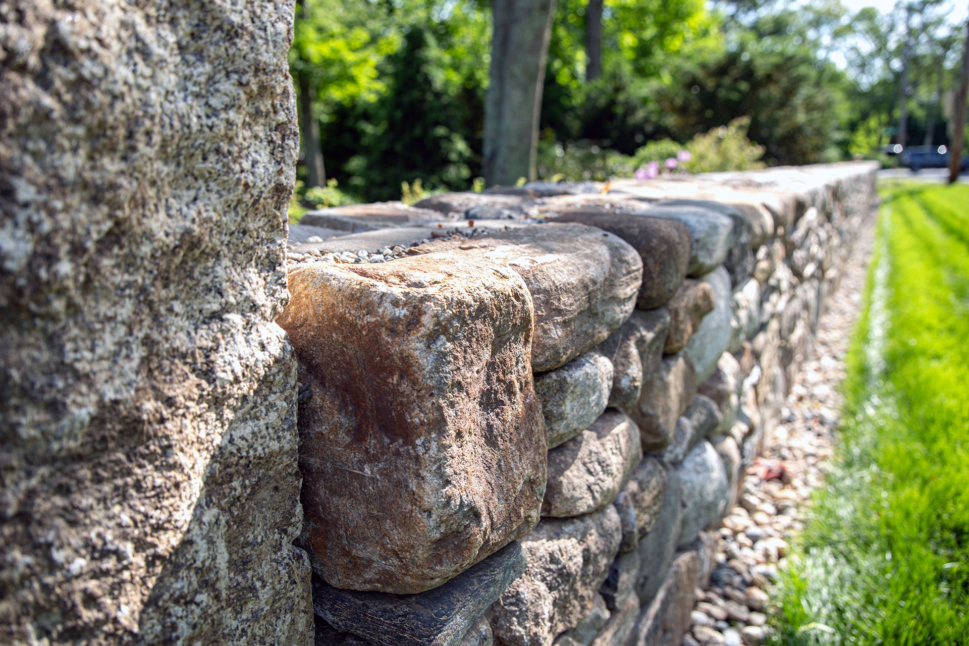 Outdoor walls and steps provide structure, durability, and visual clarity within a residential landscape. Built from materials such as granite, fieldstone, or bluestone, these elements manage grade changes, define outdoor rooms, and create safe, comfortable circulation. Styles range from dry-laid stone walls with a timeless, organic feel to mortared masonry that supports more formal architecture. Proper base preparation, drainage, and stone selection are critical, especially in the Boston area, where freeze–thaw cycles place added stress on hardscape.