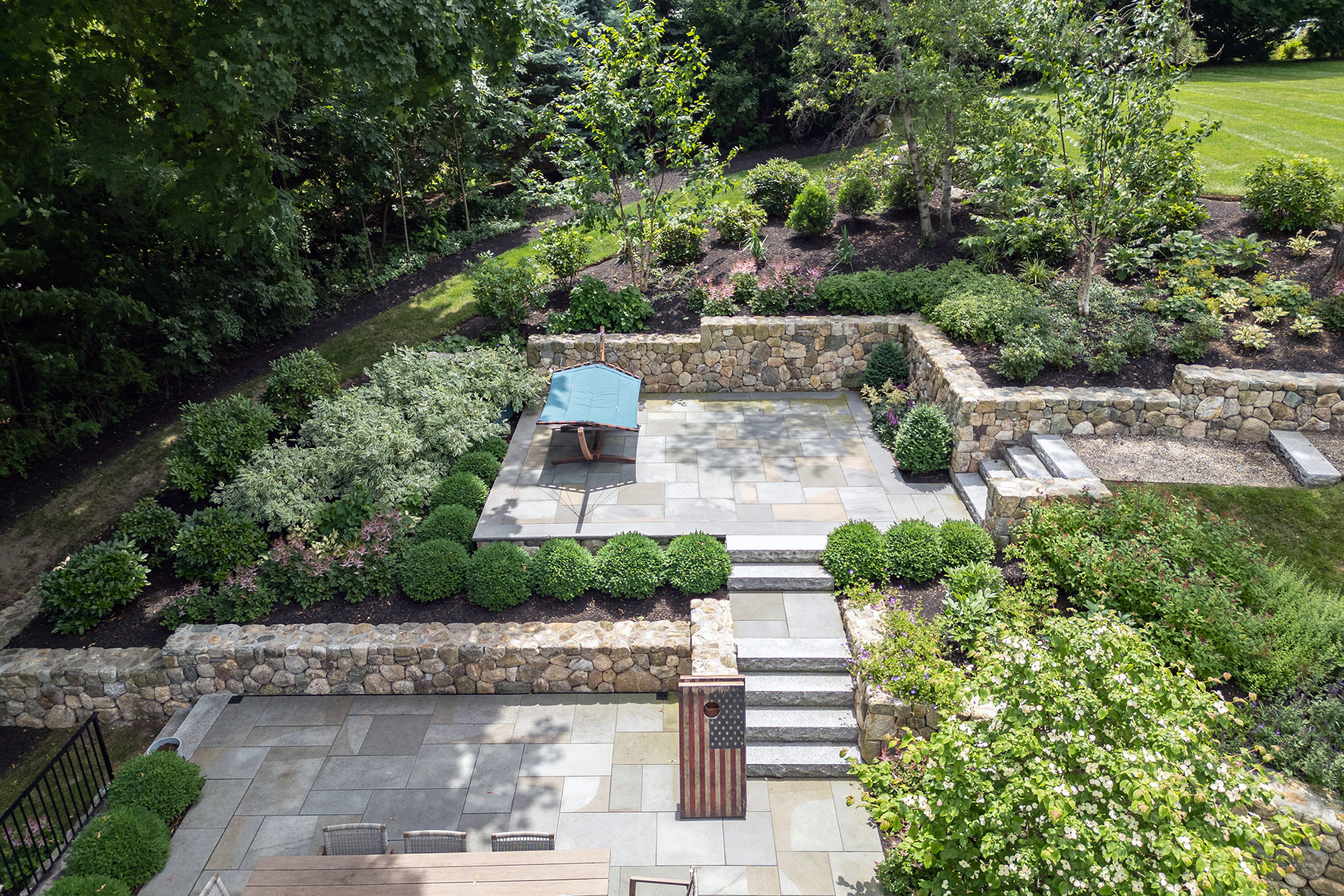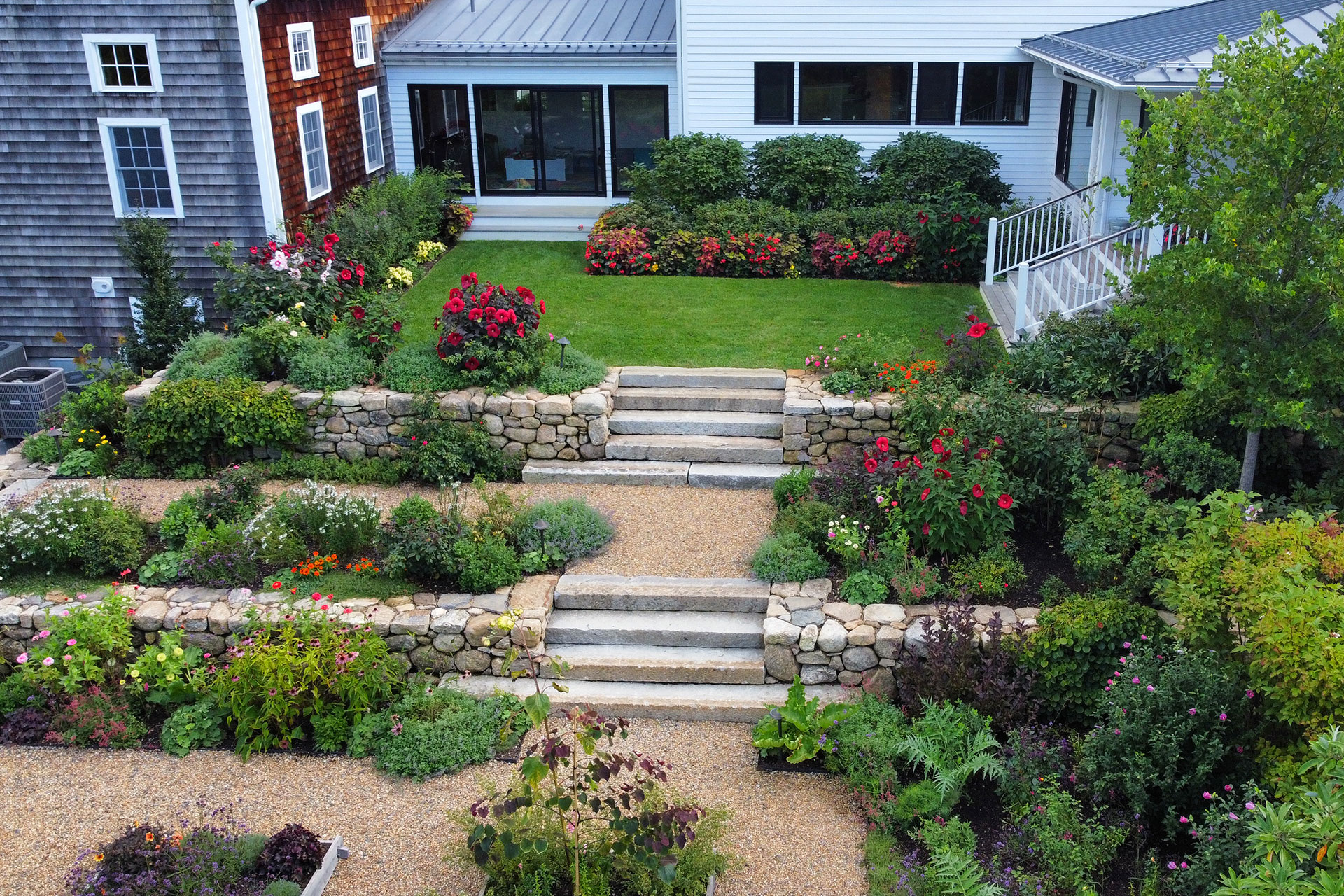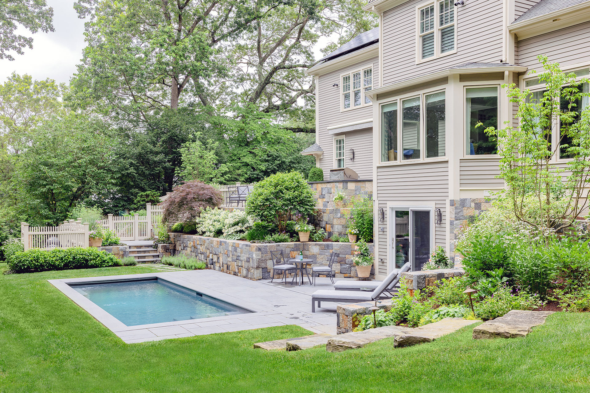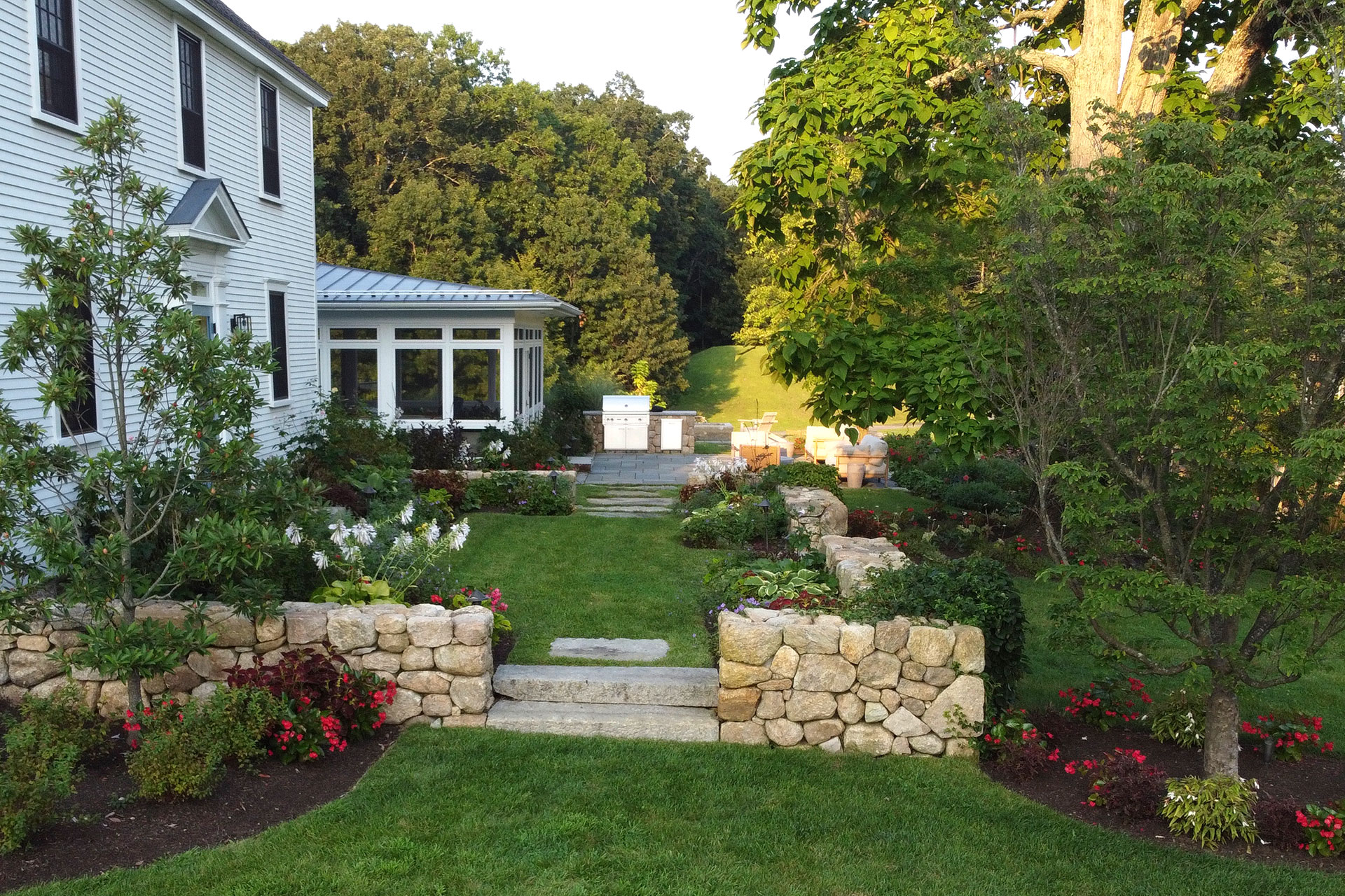 When designed as part of the overall landscape, walls and steps do more than solve elevation challenges, they reinforce proportion, guide movement, and establish a sense of permanence.