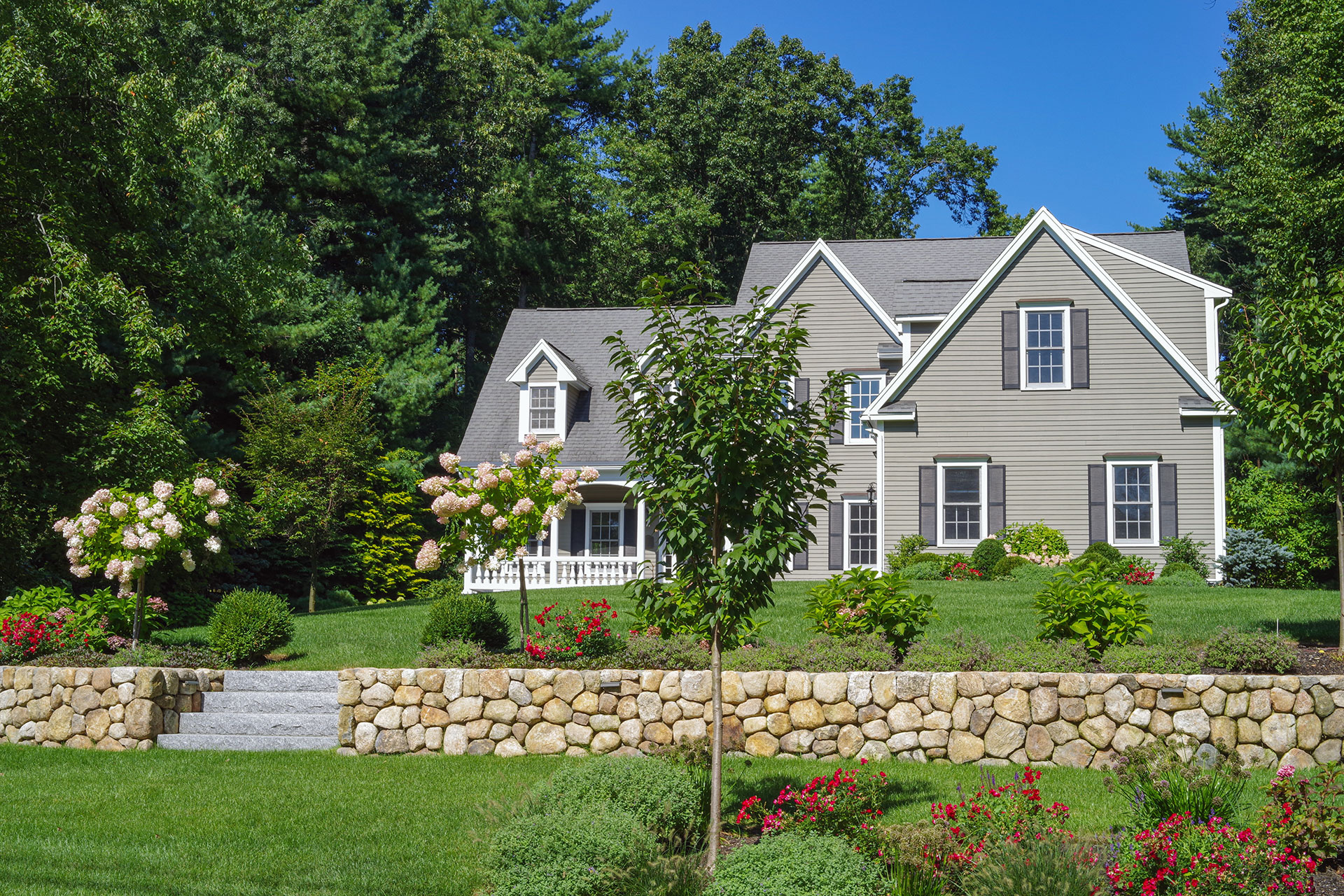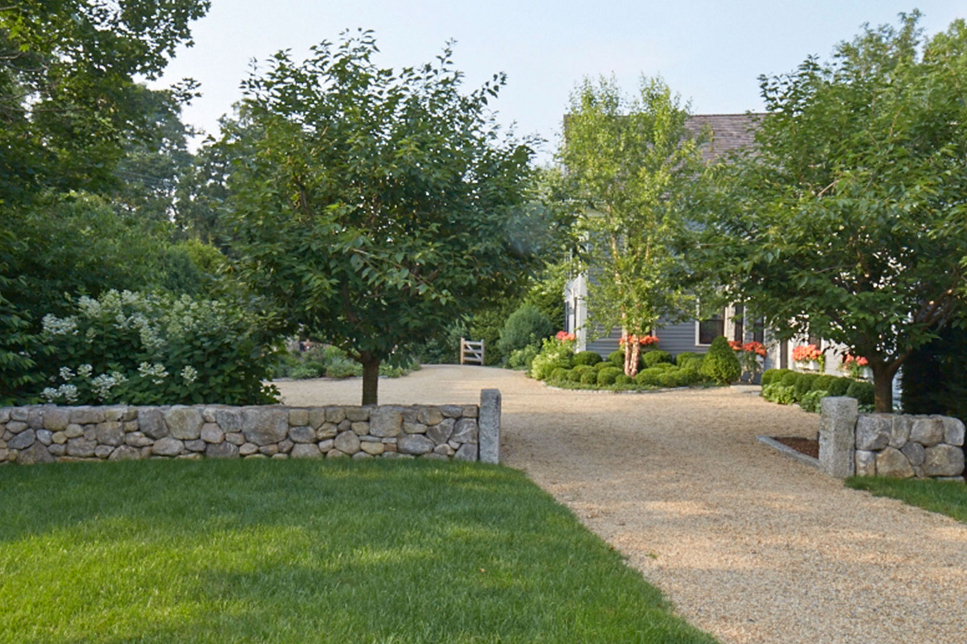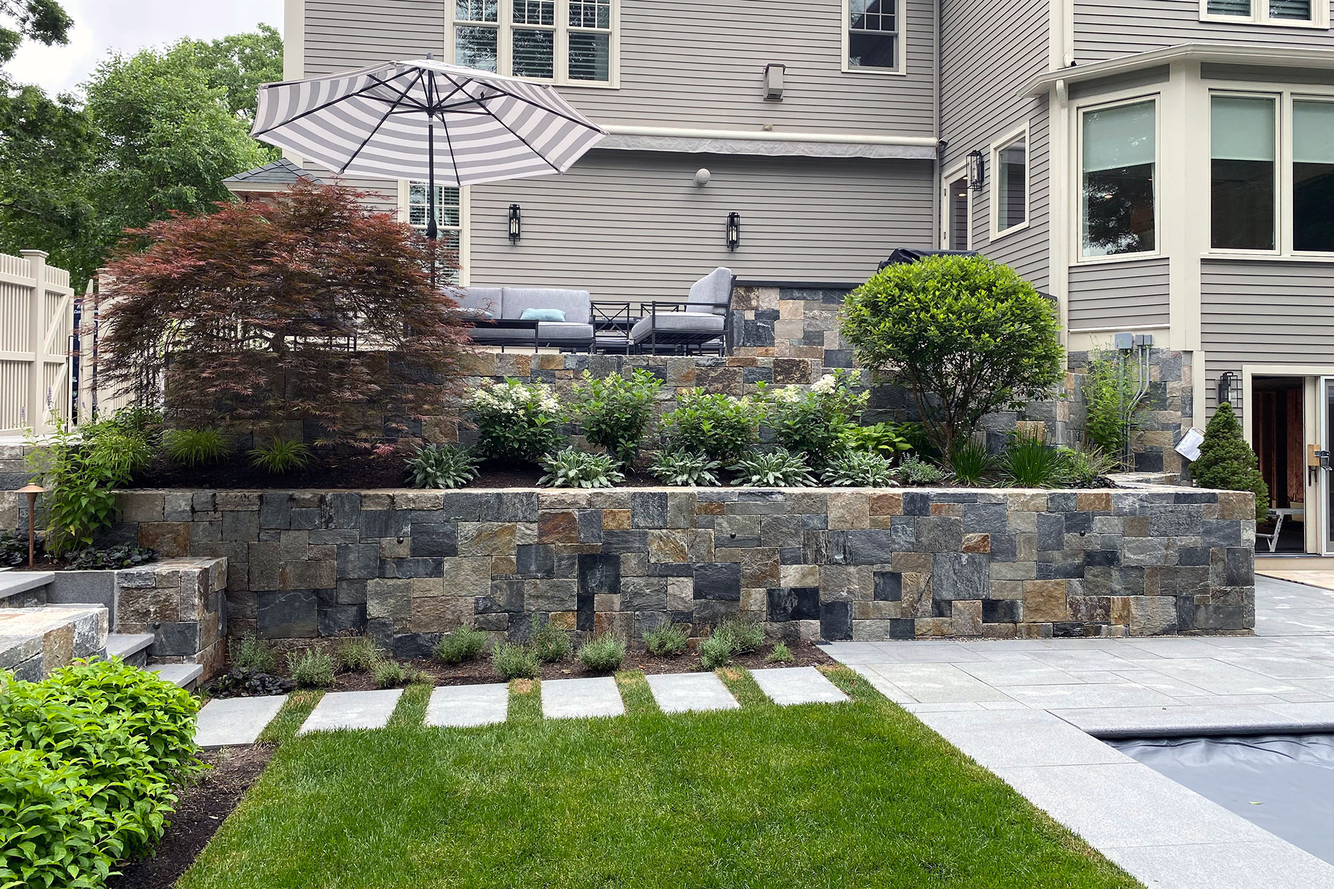 Thoughtful placement and craftsmanship elevate stone walls and steps from purely functional features to lasting design assets. Retaining walls stabilize slopes and protect planting, while freestanding walls define edges and gathering areas. Stone steps may follow natural contours or establish a clear axis that connects terraces, patios, and entries. In New England landscapes, long-term performance depends on proper footings, drainage layers, and stone thickness that withstand seasonal moisture and freeze–thaw cycles. When carefully designed and built, stonework improves everyday use and long-term property value.