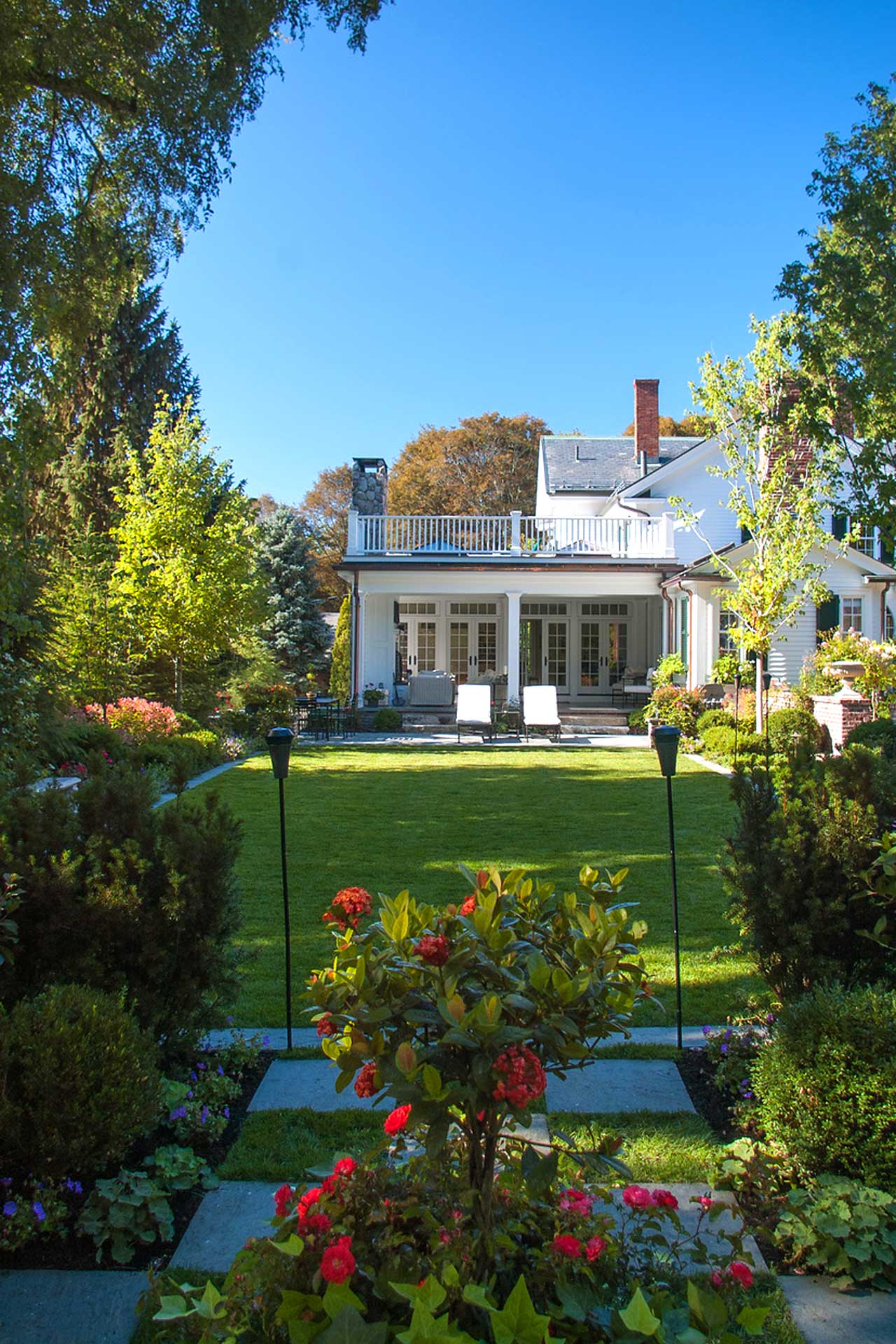 Throughout the property, features support both gathering and quiet retreat. A checkerboard lawn acts as a visual focal point leading to a secluded sitting area, while a brick and bluestone patio offers an old-world courtyard feel for entertaining. Seasonal planters add color and texture, and a permeable gravel driveway improves drainage and reinforces the property’s sustainable approach.